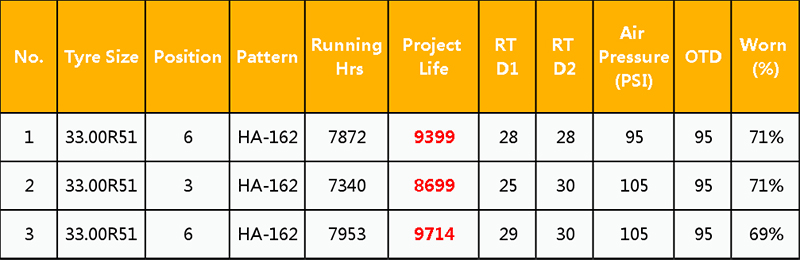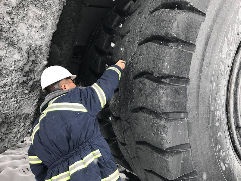 Luan 33.00R51 e 37.00 Pneus OTR R57 montado em caminhões basculantes CAT. Esses pneus de mineração estão funcionando há mais de 8.000 horas em locais de minas com neve e ainda apresentam um desempenho excelente.