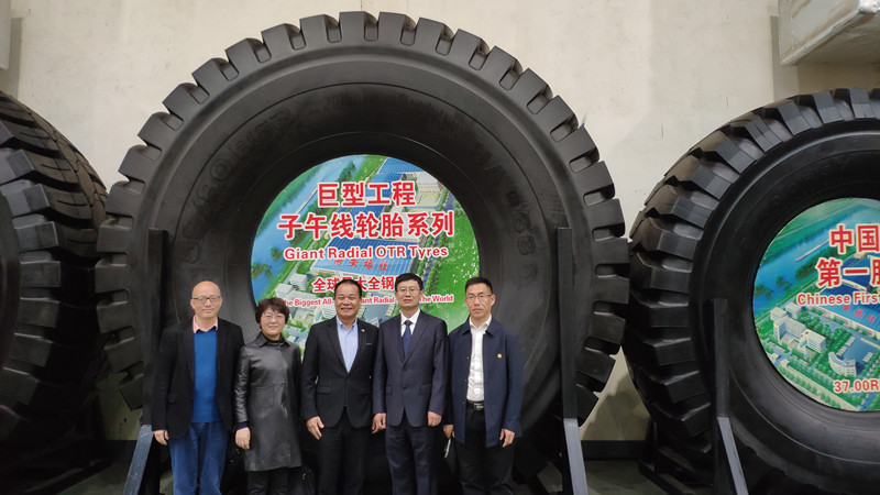 Foto 3: Os convidados participantes da reunião visitaram a fábrica de Haian e tiraram foto em frente aos Pneus Gigantes Radiais OTR