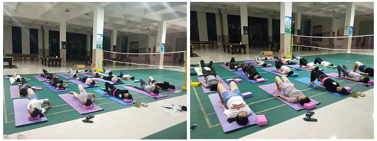 Depois de compreender os hábitos de trabalho comuns dos funcionários, o experiente professor de ioga nos ensinou movimentos de ioga, como abrir e alongar os ombros, visando as condições de trabalho sedentárias dos funcionários. Por meio de alongamento corporal profundo e métodos respiratórios corretos, poderíamos aliviar nossos músculos tensos.