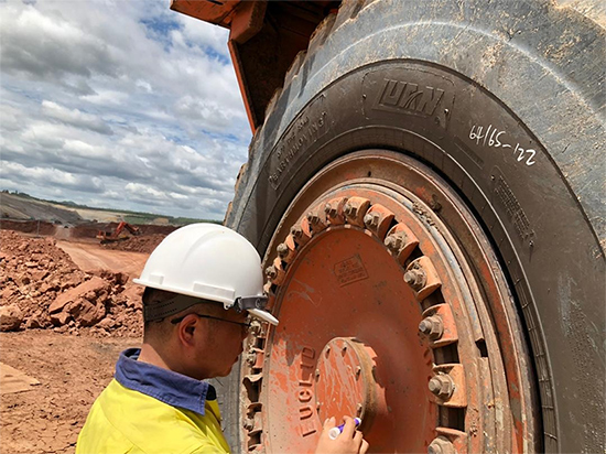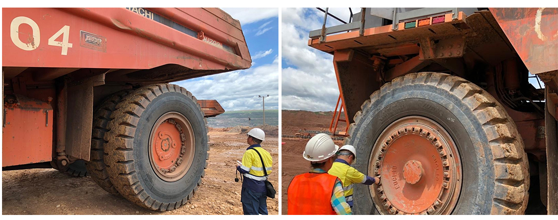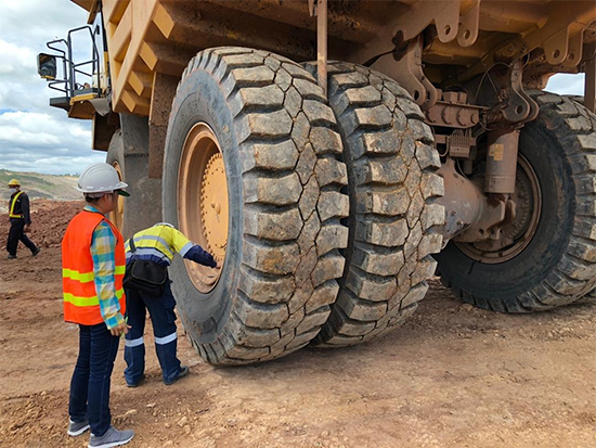 Nossos engenheiros técnicos profissionais foram para as minas de carvão na Tailândia para manutenção regular de pneus . Geralmente, os engenheiros inspecionam os pneus, banda de rodagem, aro, válvula e pressão para garantir que os pneus estejam funcionando em bom estado. Nós também fornecemos inspeção de condições de estradas e fornecemos sugestões de melhorias para promover melhorias nas estradas e evitar danos inesperados aos pneus. O engenheiro estava usando um medidor de profundidade para verificar a profundidade da banda de rodagem do pneu na foto.